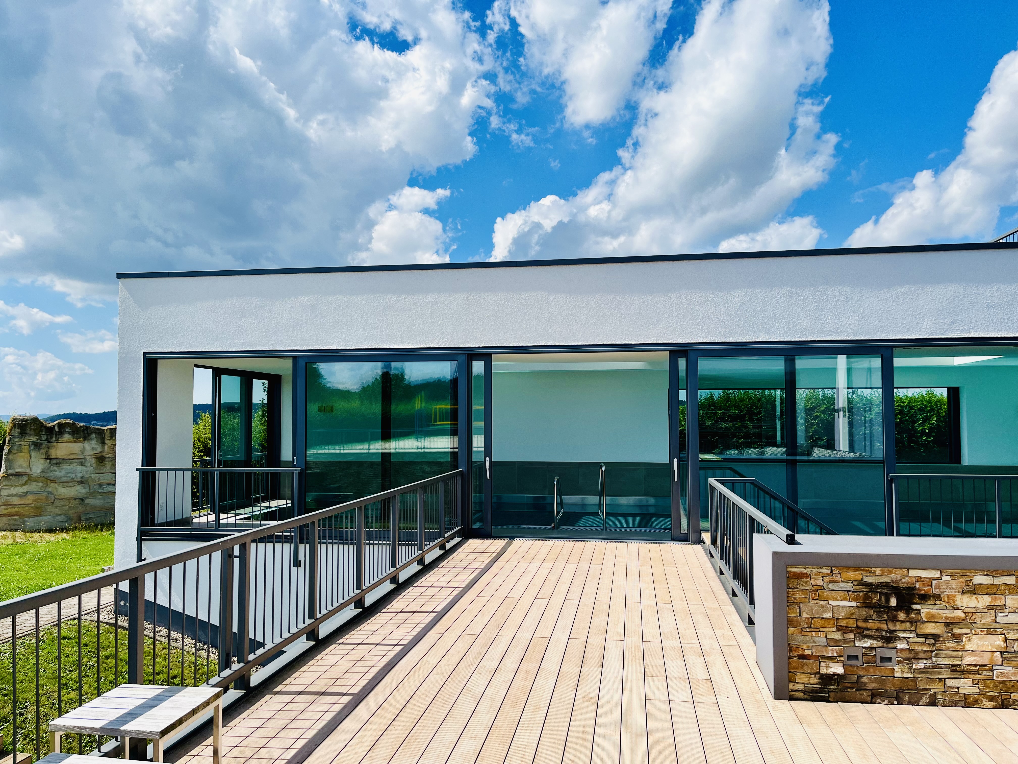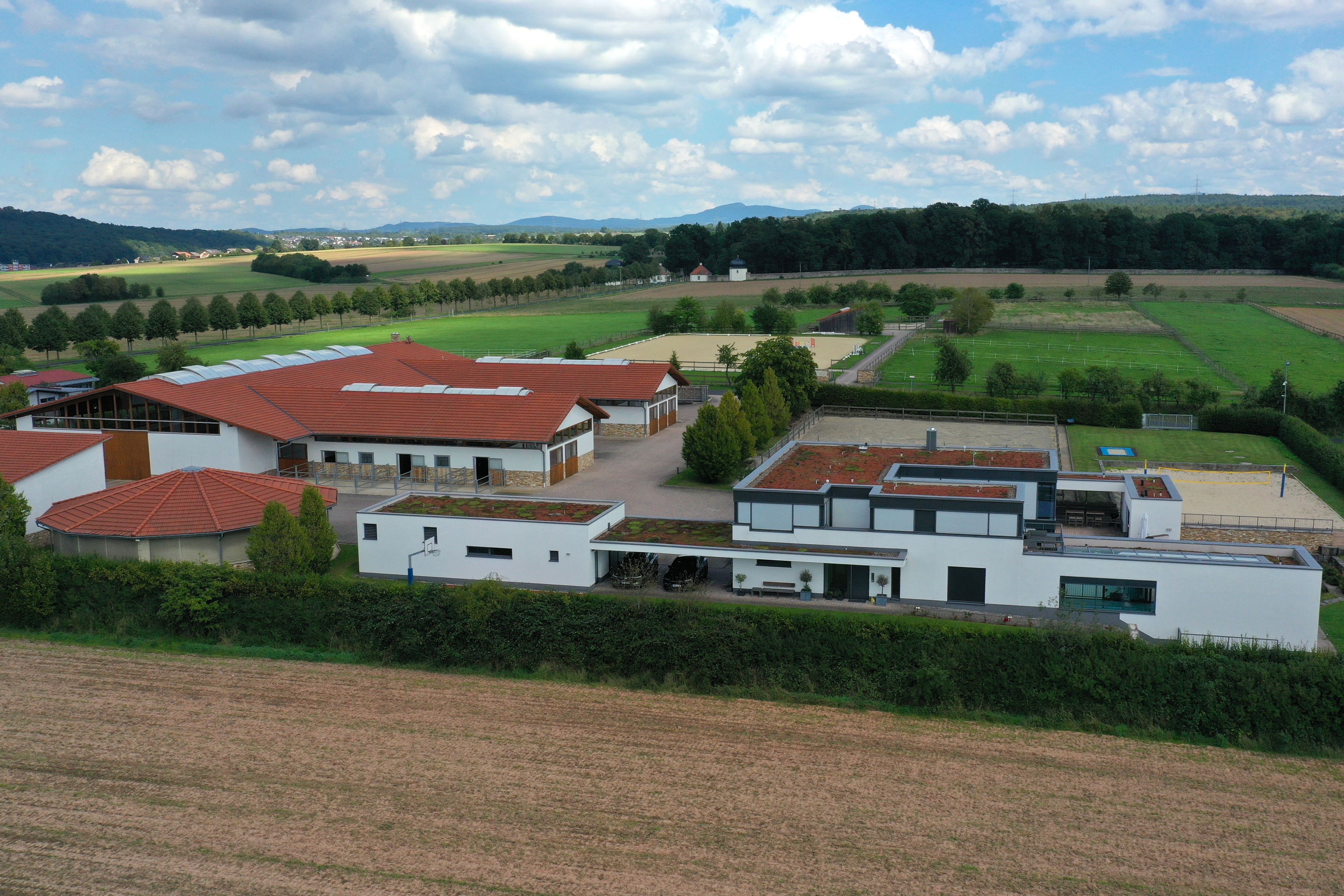 Die hochwertig ausgestattete Reitanlage umfasst Paddockboxen, einen kleinen Offenstall, weitläufige Koppeln sowie Reitplätze im XXL‑Format. Im Kopfbau der Reithalle befinden sich eine Betriebsleiterwohnung und ein stilvolles Gästeappartement – ideal für Familie, Personal oder Besucher.