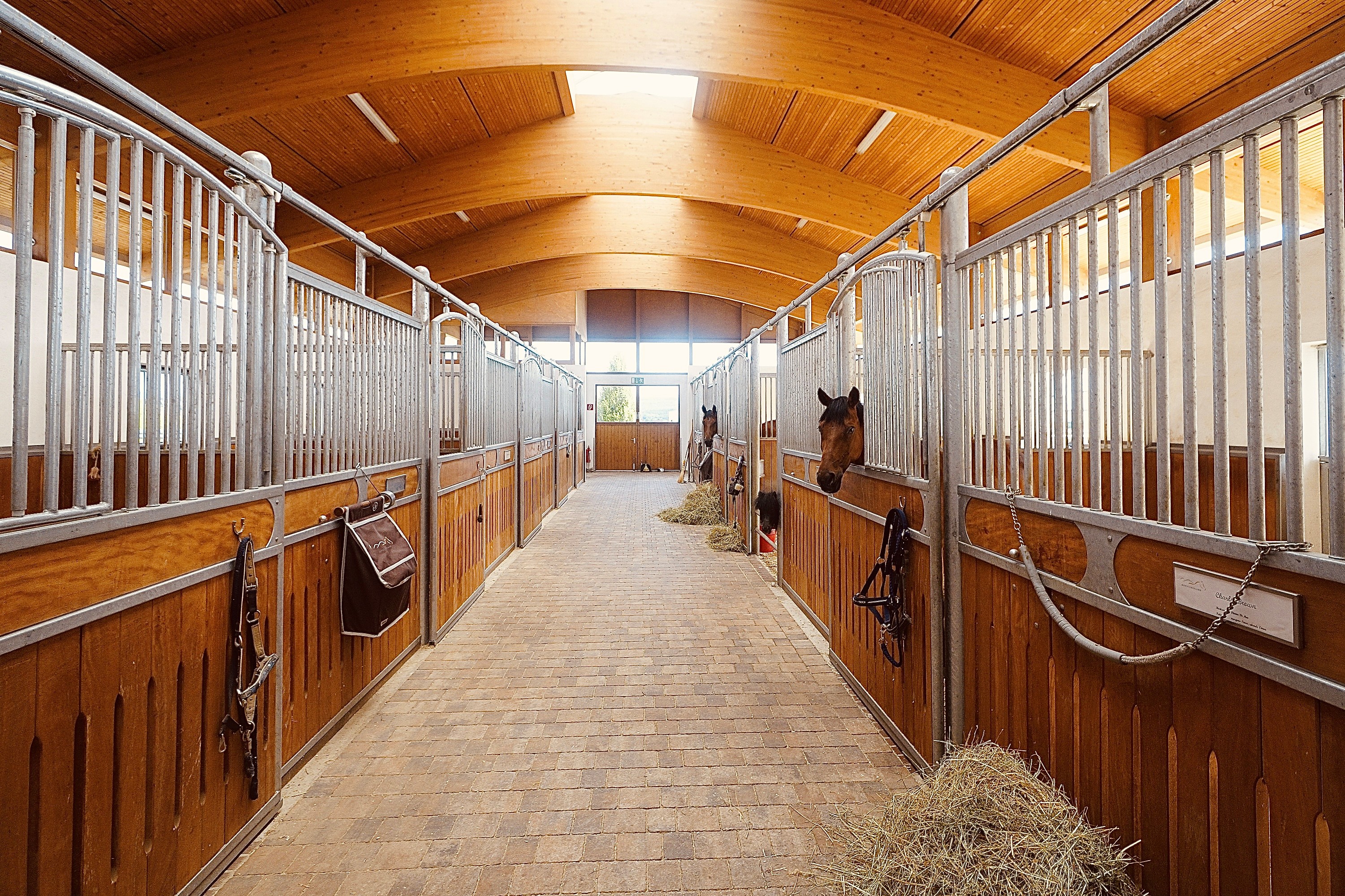 Die hochwertig ausgestattete Reitanlage umfasst Paddockboxen, einen kleinen Offenstall, weitläufige Koppeln sowie Reitplätze im XXL‑Format. Im Kopfbau der Reithalle befinden sich eine Betriebsleiterwohnung und ein stilvolles Gästeappartement – ideal für Familie, Personal oder Besucher.
